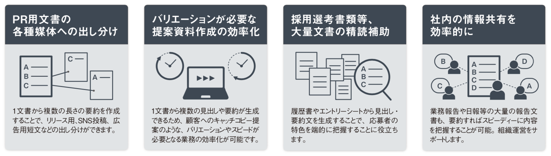 入力された本文から、自然で読みやすい見出し・要約文を手軽に生成。新幹線の速報テロップ等で実用化されている独自の機械学習技術により、文字数や文書スタイルの指定も可能。各種媒体へのPR文書の出し分けや、大量の文書の内容を効率的に把握したい時などに、幅広くご活用いただけます。