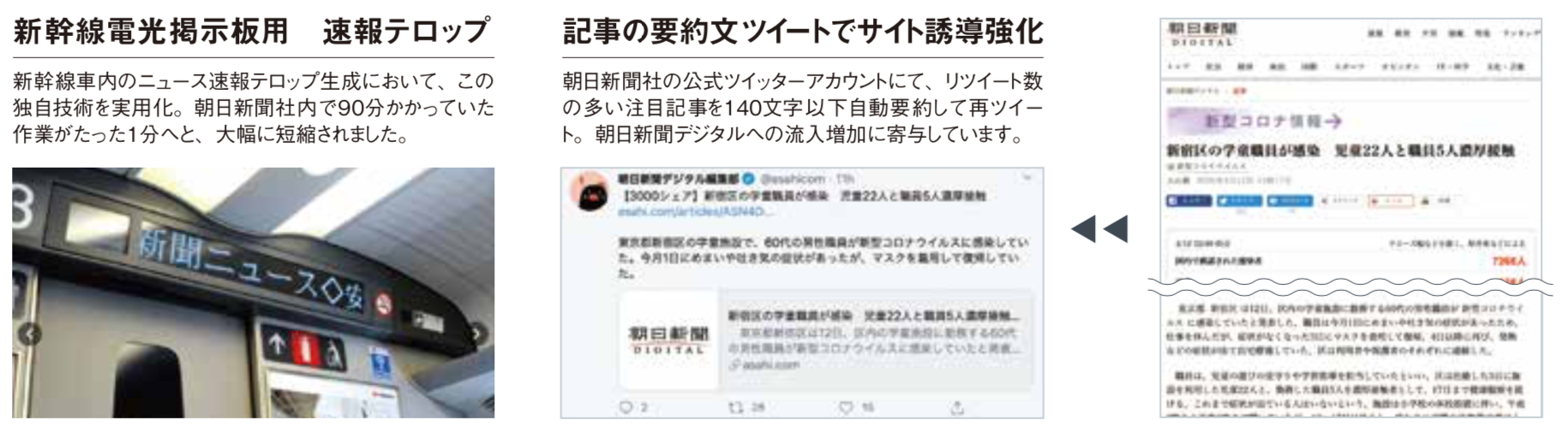 高品質な要約文生成のためには100万件規模の教師データが必要となりますが、TSUNAは朝日新聞社で蓄積した大規模データ(約500万件)を組み合わせて学習する独自技術(※)により、数万件程度の小規模な教師データにも対応可能です。